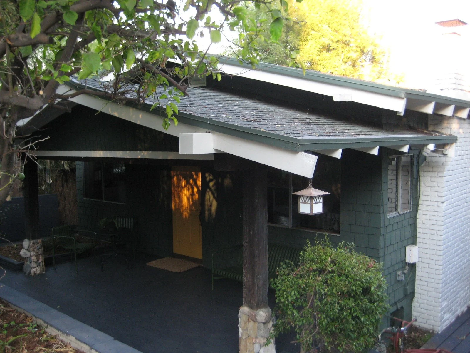 Moments from the scrappy action of Echo Park lies this c. 1917 bungalow. The vignettes from street offer a whiff of Japanese undertones, with an elongated roofline & flared eaves. Pass underneath a tongue-and-groove porch ceiling to your soaring main living space. The vibe here is almost that of a 50s post-and-beam, with pitched wooden ceilings & parquet floors, recalling the romance of another era. A statuesque fireplace invites conversation while on the other end of this room, dine beneath a wall of vintage built-ins.